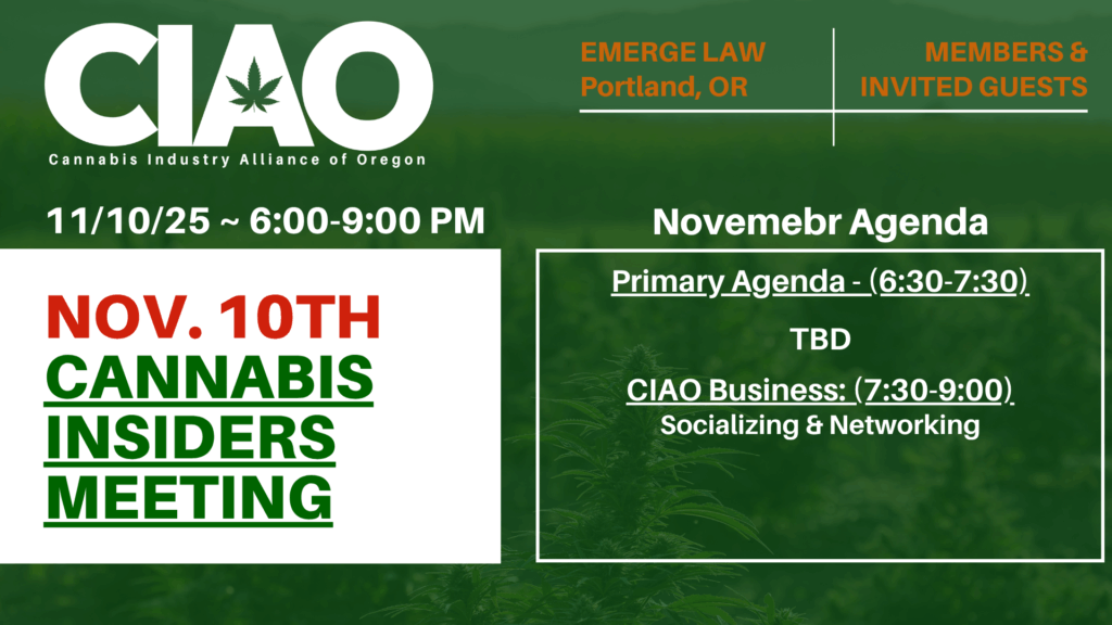 Every second Monday of the month we Host CIAO Cannabis Insiders Meeting—a one-of-a-kind event designed exclusively for cannabis industry professionals. This is your space to stay informed, connect with like-minded peers, and shape the future of Oregon’s cannabis industry. These exclusive gatherings are your chance to stay in the loop, meet amazing people, and have a great time while discussing the latest in Oregon’s cannabis industry.